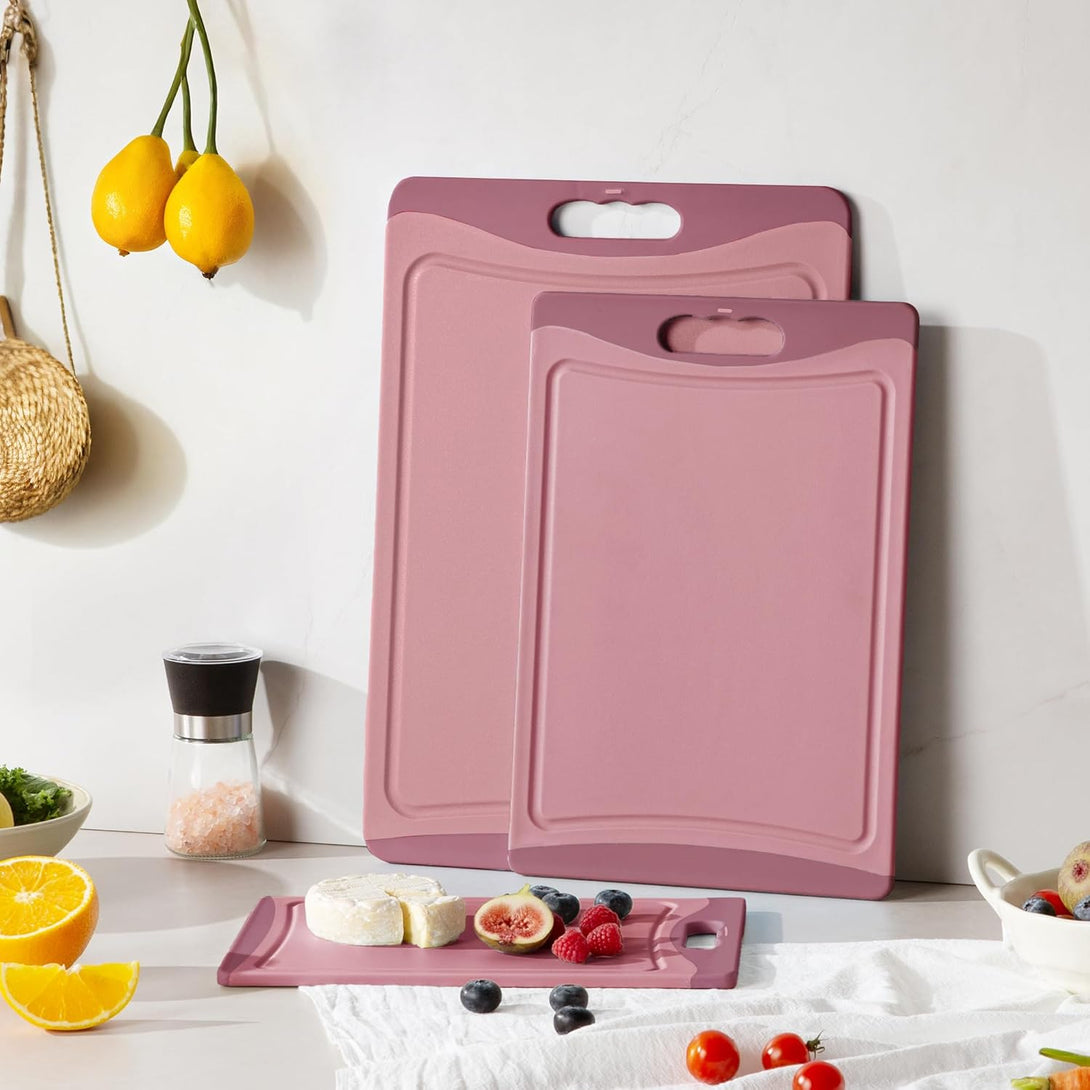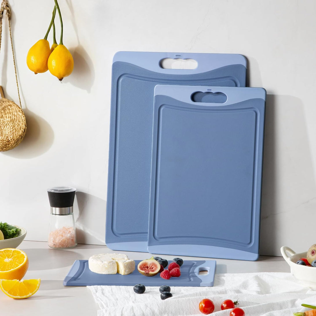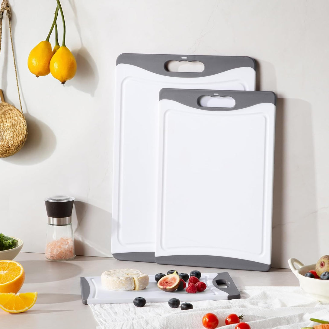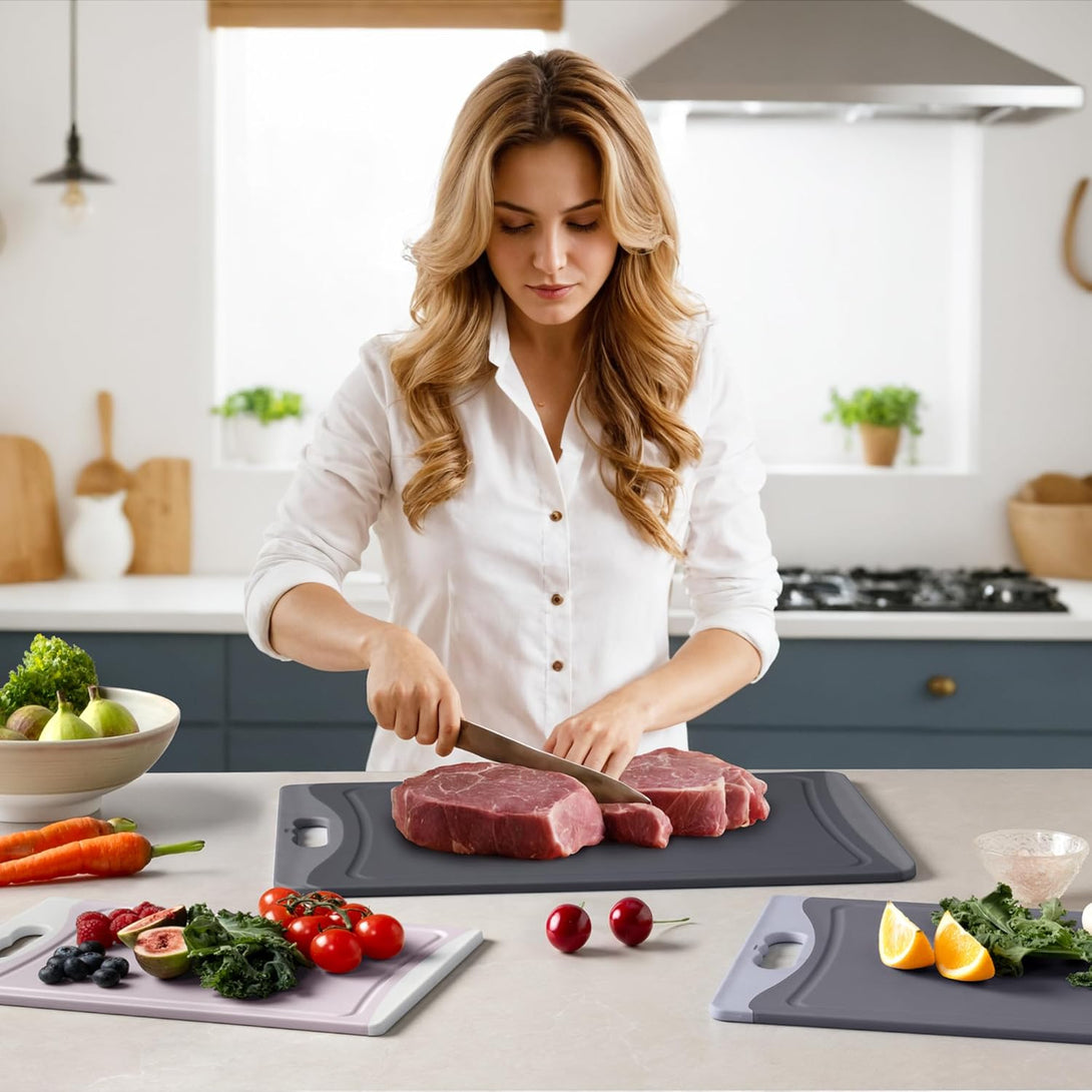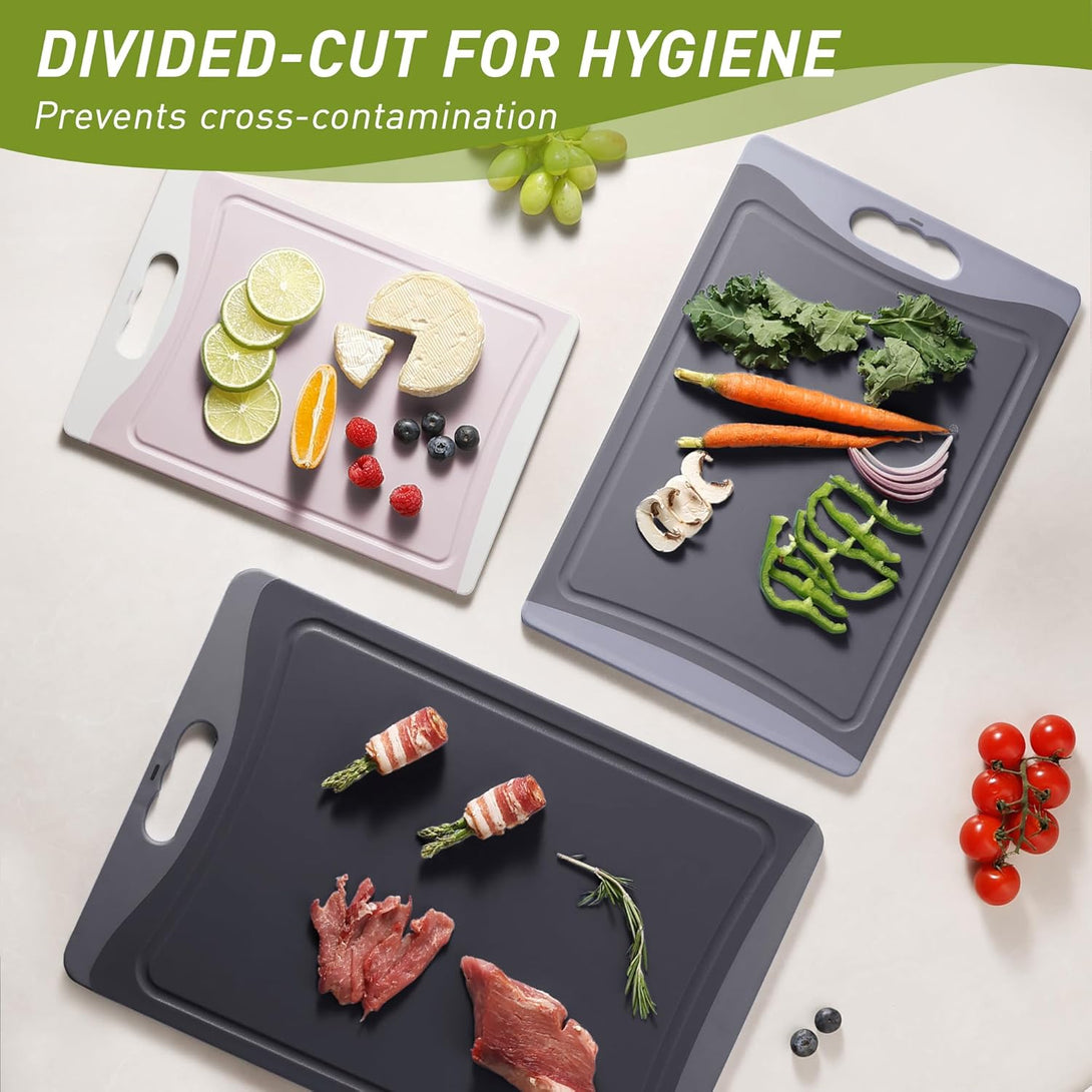 - Complete and Valuable Set: Our 3-piece plastic cutting board set offers value and promotes healthier food prep. Crafted with three distinct sizes, each board is tailored for different foods, reducing cross-contamination and ensuring a diverse culinary experience. Large for meats, medium for veggies, small for fruits, all designed to be reversible for double the utility. With thickness and durability that surpasses others, our cutting board set is a smart investment for any kitchen.