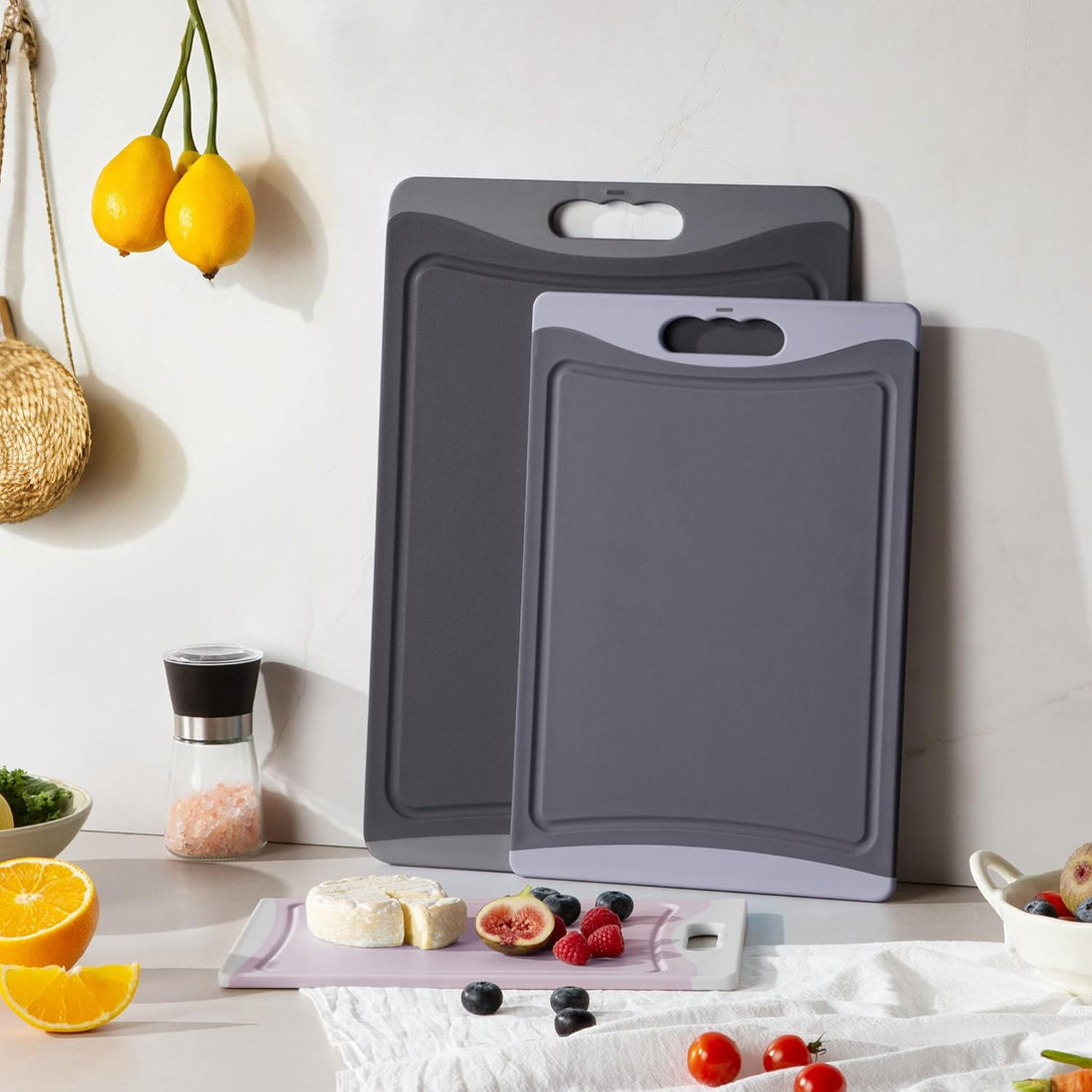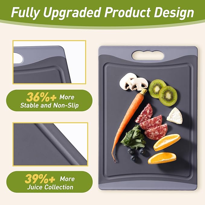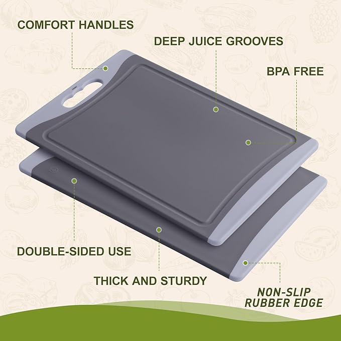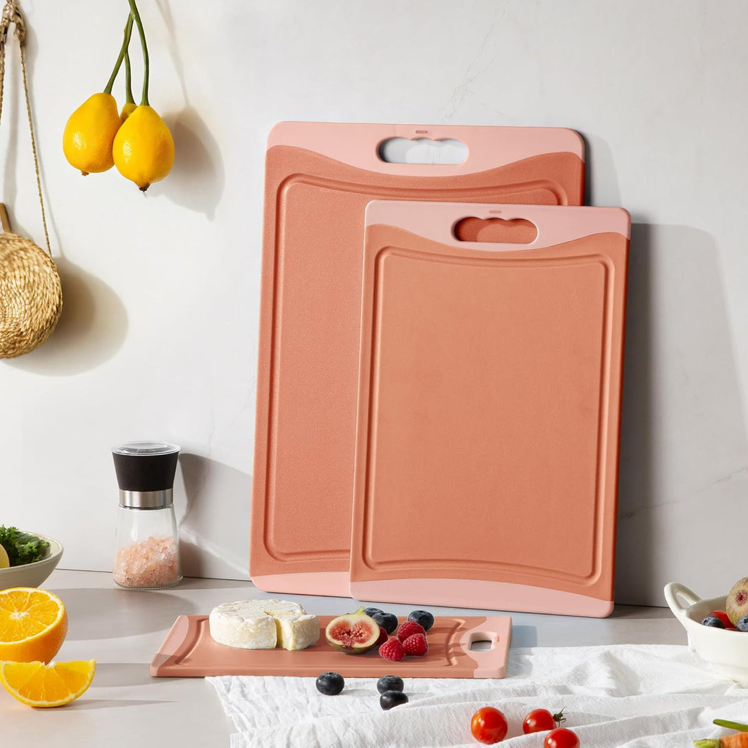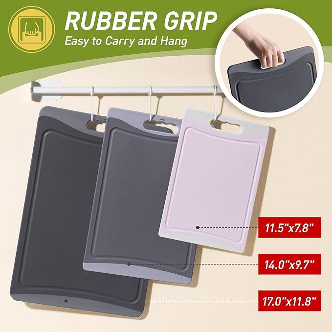 - Enhanced Stability and Spill-Resistant Design: Our 3-piece plastic cutting board set boast a user-friendly handle for secure and comfortable food preparation, coupled with a TPR-coated underside that delivers superior non-slip performance, keeping the cutting board stable on any countertop. Plus, the deep perimeter juice grooves effectively contain liquids from various foods, preventing spills and keeping your kitchen clean throughout your busiest cooking sessions.