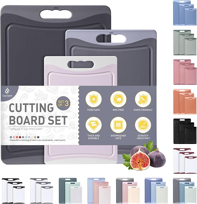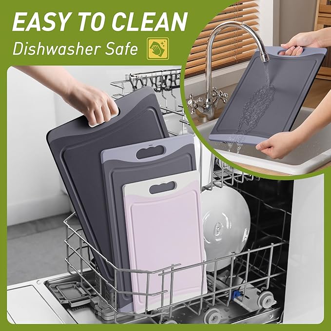 - Easy to Clean and Dishwasher Safe: Socisen's plastic cutting board set are designed for the modern kitchen, offering a non-porous surface that's dishwasher safe, eliminating the need for tedious hand washing. Simply place them in the dishwasher after each use for a quick and thorough clean, or rinse with warm water for a speedy cleanup. Easy to clean, these cutting boards are not only a practical choice but also an ideal gift for cooks and bakers who value convenience and hygiene.