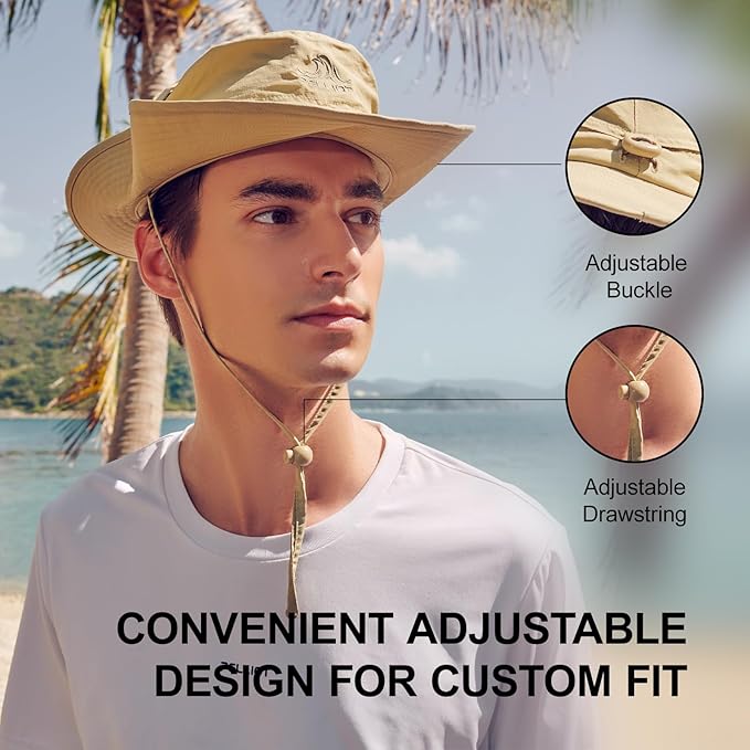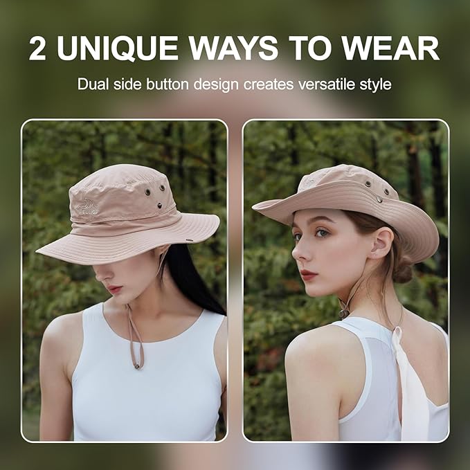 Stay protected, even on windy days! The adjustable chin strap and elastic buckle at the back ensure a snug, stay-put fit. Plus, snap-button sides let you switch up your style—wear it as a classic fishing hat or roll up the brim to transform it into a cowboy hat in seconds.